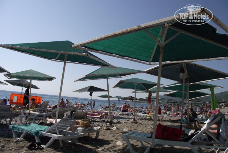 Пляж отеля около 40 м в длину. Отель был переполнен. Как думаете 26 зонтов и 70 лежаков достаточно на 200 человек туристов? Все зонты ржавые и установлены низко, народ бъется о них головой постоянно. Половина лежаков сломана, но и сломанные заканчиваются в 8 утра. На песке лежать не очень приятно, так как пляж не убирается, поэтому в наличии все, от окурков, салфеток и туалетной бумаги, до пробок от бутылок и мелких стекол. Фотографии пляжа и лежаков прилагаю. На пляже есть душ и кабинка для переодевания, из которой туристы сделали туалет. В нее ходить не советую. Туалет вдруг стал платным. Юркий турок в красных трусах ходит по пляжу и собирает пустые банки, изображая бич-боя, а потом гоняется за туристами и требует с них по доллару за вход в туалет. Ну, и для особо впечатлительных: русские пенсионерки за 60 лет не стесняются переодеваться на пляже Так что Анапа и Геленджик 80-х –Добро пожаловать!