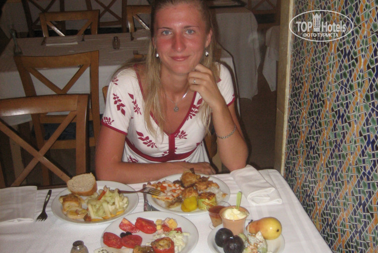 Был полупансион! Жить можно еще и как!!! Завтрак 6-10 Омлет, яйца, блины, сосиски, овощи, фрукты (сливы вкусные), булочки, сыр, колбаса, мюсли, чай, кофе, газированные напитки. Ужин 18-21. Обжираловка! Даже для любителя европейской кухни! а для любителей острого смертельно опасно не выйти вовсе из рестарана! Даже перечеслять не буду все многообразие слюньки потекут. Даже без воды на вечер можно обойтись (ни разу не заказывали) берешь "тазик" арбузов, дыни, груш, слив, инжира, винограда, вкуснейших персиков и пить уже не хочется. Мороженное 4х видов (белое - лимонное - рекомендую). Вода в отеле 1.2 динара. (1 динар где-то 22 руб), если выйти из отеля и в право метров 100, то за полтора литра 0,7 динара. ну или как вариант познакомиться с кем у кого все включено.
