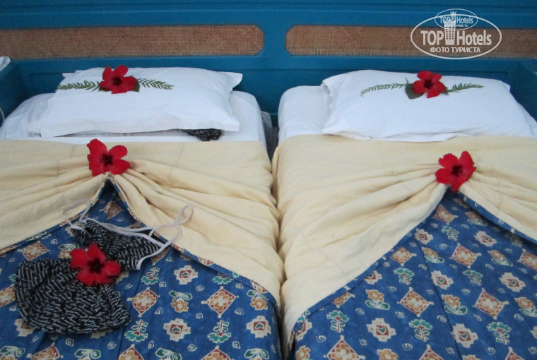 До отеля ехать 2,5 часа немного утомляет но в предвкушении отдыха это не столь важно. По приезду заполнили карточки и через двадцать минут уже нам дали номер, хотя мы приехали в 12-00 по местному времени, а заселение обычно в 14-00. Номер дали суперский, в том плане что он с видом на море на втором этаже, открываешь двери и вот она красотища!!!=) Мебель в номере старенькая, но все очень чистенько, убирали каждый день, мы оставляли по динару(20 рублей) через день нам украшали кровать цветочками, мелочь, но приятно) В нашем номере была ванная с высокими бортиками, поэтому воды но полу не было, мы проходили мимо других номеров там был невысокий бортик и скорее всего когда люди мылись вся вода была на полу.