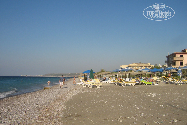 Пляж: через дорогу, галечный, со своими бесплатными зонтиками и шезлонгами. полотенце можно взять на ресепшене под депозит в 10 евро. пляж грязный, море у берега тоже, только если подальше заплыть, будет прозрачное и чистое. на пляже есть бар (с 11- 16). из 7 дней, что мы провели в этом месте, море было относительно спокойное только в последние 2 дня, в остальное время шторм.