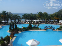 Мы бронировали Junior Suite. Номер общей площадью, наверное, квадратов 35. С видом на море (НЕ на основной пляж - это важно), с большой террасой, со столиком и двумя креслами. По приезду в номере нас ждала бутылка местного марочного вина (нам не понравилось), бутылка минералки и пара яблок - комплимент от отеля. В номере кофемашина, чай, капсулы для кофемашины, сахар, сливки, чашки-бокалы, чайник... все по полной программе. Мини-бар платный. Большая двуспальная кровать с архиудобным матрасом. Ребенок спал на диване, который трансформируется в полноценную двуспальную кровать. Огромное зеркало, под ним такой же длины стол с гранитной столешницей (хотя в камнях я не спец. но камень натуральный). Это напротив кровати. Напротив дивана, на котором спал ребенок маленький журнальный столик и два кресла. Большой телевизор (3 русских канала) и DVD-плеер. Ванная комната большая. У нас там стоит угловая ванна идеальной чистоты, компакт, угловая гранитная столешница с раковиной, два зеркала.