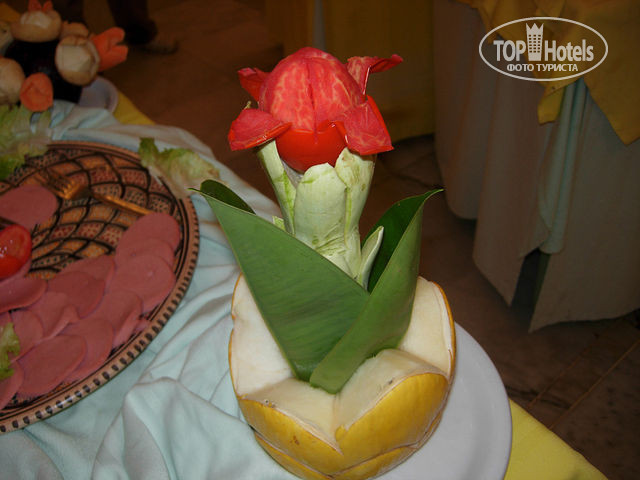 несколько видов ,салаты,гарниры,фрукты,пирожное.Обслуживание персонала отличное.Работа аниматоров просто супер.Скучать не дадут не кому.
