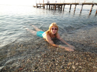 Море чистое, очень теплое. На пляже лежаки, зонтики, матрасы, полотенца бесплатно. Правда пляж маленький. Но места хватало всем. На пляже только юпи.