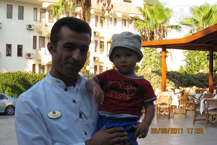 Всем привет!Первый раз были в Турции,общее впечатление хорошее.Маленький ребенок 1.4года.Разместили сразу по приезду, в двухкомн.номер без всяких доплат(т.к. был в подвале и на 4-ом этаже,а у нас мал.реб.).Номер отличный 2 балк.,2 ван.ком.,только шумно вечером,бар напротив. Питание:всегда рыба,курица,индейка 2 раза была(вкусная),раза 3 говядина тушеная,свинины не было,овощи,фрукты разные и много,и вкусно.Для ребенка каждый день было молоко,каша,омлет,можно было накормить,но с собой мы брали пюре дет.,соки на всякий случай,пригодились,иногда прикармливали. Персонал хороший, особенно к детям все заботливо относятся.Убирали 3 раза за 7 дней,1 раз цветами украсили комнату. очень красиво,оставляли 2 дол. Территория не большая,зеленая,курочки бегают травку жуют,бассейн хороший.Море супер,пляж не большой, но места всегда были.