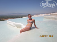 в Памуккале поехали на 4 день пребывания в Турции. ехать часа 4, подъем очень ранний. кто поедет, обязательно берите что-то попить. в кафе останавливают, еда включена в стоимость экскурсии, а вот чай, кофе, соки там за 2$! по пути заехали на дегустацию вин из фруктов, плодов без спирта и сахара. вина конечно потрясающие, там же их можно было приобрести за 25$ за бутылку, если покупаешь 4 бутылки в упаковке, то за 80$. когда приехали на место сначала посетили бассейн Клеопатры, заплатив дополнительно 16$. вода там 36.6 градусов, даже выходить не хочется, на вкус как минералка, все тело покрывается мелкими пузыриками и такое ощущение буд-то купаешься в шампанском. жаль, что время было ограничено. Памуккале называют восьмым чудом света и это действительно неописуемой красоты место! еще там же посетили Амфитеатр, в котором раньше проводились гладиаторские бои. там тоже красиво! и пейзаж открывается замечательный с верху Амфитеатра. по дороге обратно в отель нас завозили в магазин сувениров из камней, на текстильную фабрику. советую ни чего там не покупать, потому что рядом с отелем очень много разных магазинов и там все тоже самое можно купить за гораздо меньшие деньги. например маленький сувенир из камня на экскурсии предлагают за 10$, а в магазине я покупала за 2$, полотенца бамбуковые предлагают за 15$, мы купили за 10$ недалеко от отеля и т.д.