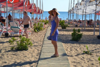 Погода замечательная, бассейн на территории огромный, чистый, ребенка оттуда не вытащить. Лежаков всем хватает, хотя народу довольно много. До моря прогуляться или проехаться проблем не составляет. Море хорошее, очень теплое, вода прозрачная, дно песчаное, нам очень нравится, что дно пологое - ребенку удобно купаться. Пляж вполне приличный,большой, лежакоd нам троим всегда хватало, в какое бы время мы не пришли.