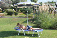 Теперь про море, пляж, и лежаки. Полотенца можно было менять каждые 5 минут. 2 бассейна, рядом лежаки с зонтиками, найти место можно было в любое время, единственное очень много хлорки в бассейне было, поэтому мы в основном были на море. Лежаки бесплатные, пляж хороший, с каждым местом был горшочек для мусора, а то, что раскиданы бычки, это уже человеческое отношение, иногда людям лень протянуть руку или дойти до мусорки. Пляж убирают, даже нам помогали лежаки перетаскивать – это очень приятно. Море хорошее, песчаное, чистое и прозрачное, с пологим заходом.