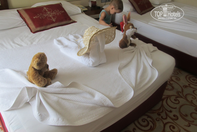 Не очень понравилось, что в номер нас заселили не сразу, заселение было после двух часов, а мы приехали в 12 и ребенок маленький с дороги устал. Но ближе к двум часам нам уже вручили ключи от номера. Никаких взяток на рецепшен мы не давали, номер достался хороший и уютный, на третьем этаже В номере все было целым, посуды достаточно, номер убирали каждый день и даже когда попросили приходить с утра, без проблем, стали убирать в то время, пока мы на завтрак ходили. Оставишь чаевые - накрутят лебедей, не оставишь - просто аккуратно уберут. Кондиционер работал неважно, при включении из него сперва какой то затхлый воздух дул. Мини бар пополняли ежедневно, правда сок какой то невкусный был, дети его не пили, брали или в лобби баре, или в столовой.