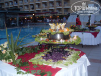Питание: С утра до поздней ночи (ночные супчики) широкий асортимент блюд. Мясо, рыба, птица, овощи, фрукты. Свежевыжатые соки от 1 $. Вечером мороженое, накрытие детских столиков.
