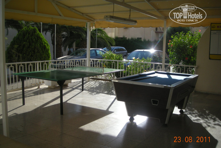 Отель понравился, обслуживание и развлечения в отеле тоже.Не буду повторять все плюсы и минусы отеля, так как много уже было про это написано. Только добавлю то, что не соответствует написанному об этом отеле на сайте Pegas (так как ездили от этого туроператора). Покрытия пола у нас вообще не было, был просто кафель (может у кого и был ковролин, как заявлено на сайте, но у нас была студия, и там был только кафельный пол). На балконе стоит пластиковый круглый стол и два стула, все белого цвета ( такие, как на дачах). На кухне плюсом к тому, что написано еще можно добавить, что есть посуда. Еще имеется и радио. Бассейн открыт с 9 утра до 7 вечера, а не до 4, как написано на сайте. Интернет услуги стоят 6 евро в час, 4 евро за 30 мин. Но все ловят Wi-Fi около дороги отеля, там ловит интернет от кафе. И всегда сидят люди с компами. Игральные автоматы, те что располагаются во втором корпусе стоят от 0,5 евро до 2 евро за игру. Дети умудрялись бросать 2 рубля наших и автоматы съедали и дети играли! :) Детский клуб работает с 10 до 11 утра, потом с 3 до 4 вечера. (посещение только с родителями). Пляжные полотенца выдаются под депозит 2 евро. Не забудьте купить (можно прямо на месте) английский переходник для розетки! Есть еще и тренажерный зал. бесплатный. Вот, наверно и всё. А так - советую приехать в этот отель с детками - не пожалеете! :)