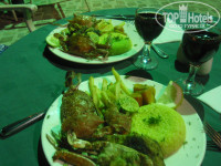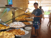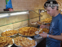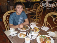 Приехали в отель в полдень. При входе на ресепшен нам дали тепленькие полотенца для рук и прохладный сок, что было приятно после трансфера. Наши вещи сразу забрали в камеру хранения. Надели нам браслеты, и предложили пройти в ресторан пообедать. Сразу понравилось приятная обстановка, приветливые взгляды обслуг, разнообразие блюд. Некоторые блюда были мною впервые увидены и непонятны мне, поэтому брал по чуть-чуть, и потом со временм я уже знал что мне брать или не брать. Столько блюд, аж глаза разбегаются, и все охото попробовать: курица, рыба, сосиски (не очень), котлеты, рис, картофель, сыр, колбаса, овощи, фрукты и многое другое. Особенно мне понравилась выпечка и фруктовые пироги - это просто супер, запивал кофе с молоком или чаем. Видимо менталитет такой у меня, я всегда брал с собой в номер два больших кусочков фруктового пирога и два фрукта, хоть это и запрещено, но на выходе мне никто из работников ресторана ничего не сказал. Вот щас пишу об этом, и сразу захотелось туда полакомиться. Соки согласен не очень-юпи. Газировки хорошие, местного производства, со своими названиями, близко похожие на продукцию кока-кола.