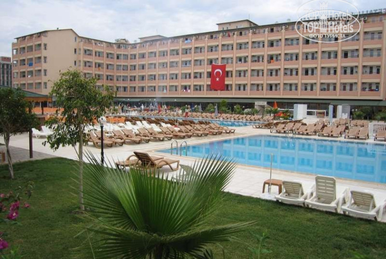 Вот на фотографии вся территория Эфталии, на ней два маленьких бассейна и пару десятков молодых пальмочек и кустиков...И все!!! И это на такое огромное колличество народа. Кошмар!!!
