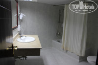 На первый взгляд номер очень понравился - три дивана, телевизор плазма, мини бар с водой и бутылкой колы, холодильник, чайник, чай (редкостная гадость - 4 вида чая, при этом черного нет, один зеленый, один красный, остальные два больше напоминают травяной настой). Через пол часика стали вылезать косяки. Попытка сесть на первый диван - неудача, ножка не прикручена снизу, а просто подставлена, чтоб не падал. жаловаться не стали, сами пилочкой для ногтей закрутили, но позже. второй диван - тоже неудача, он облокочен на колонну и это неспроста - сломано крепление спинки(даже на фото видно), диван не собирается, облокачиваешься назад, и он от колонны отъезжает. Но, слава богу, самый большой диван цел, а нам двоим больше и не надо =) ванная комната тоже большая, тут тоже косяк - шторки не хватает на всю ванную, либо вдоль, либо с торца остаются дыры, либо мыться оооочень аккуратно, либо неминуема лужа.