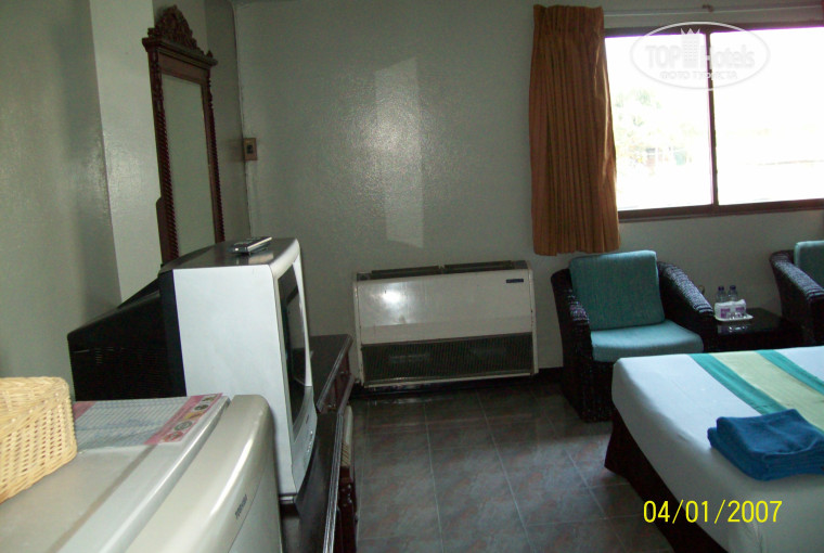 Приехали в отель около 14:00, поэтому ждать заселения не пришлось. Сразу заплатили 1000 бат за депозит, которые потом без проблем вернули. Увидев номер были немного разочарованы – мебель старая, в матрасе спиной ощущались пружины, кондиционер древний и по ощущениям работает больше как вентилятор. Полотенца пахли какой-то подтухшей рыбой. Душ ничем не отделен от туалета, таким образом, при его использовании мокнет всё вокруг, и туалетная бумага в частности.)) Вид был на стройку и маленький рыночек. Потом мы поменяли номер (первый был с одной кроватью, а нам нужно было две) следующий оказался уже получше. Из окна видна пальма и в ванне-туалете уже присутствовало хоть некое подобие душевой кабины. Правда, у него оказались свои недостатки – начиная с 6-7ч. по вечерам орала музыка из окрестных ресторанов часов до 2-х ночи. Постельное белье более-менее чистое, пятен не было, вся техника функционировала. Никаких насекомых в номерах не было, кроме местных микромуравьев, которые мгновенно сбегались на любую, оставленную неприкрытой, еду, особенно сладкую. Убирались каждый день, но увидев, что уборщица только пыль поднимает во время подметания, попросили ее не убираться у нас. По настоятельной рекомендации гида, деньги и документы хранили в сейфе на ресепшене (слышала, что они есть в некоторых номерах, но ими нежелательно пользоваться, т.к. частенько воруют) в номере иногда оставляла немного денег и фотоаппарат. Прятала это под подушку =) тьфу-тьфу, ничего не пропало. Завтраки весьма посредственные, каждый день одно и то же, да и то… малосъедобное. Каждый день стабильно были суп из риса, простой белый рис, два вида тушеных овощей с мясом (овощи крупно порезаны и очень жесткие), ветчина, сосиски и яичница. Из выпечки был ТОЛЬКО простой белый хлеб! Из фруктов арбузы и ананасы. Нарезанные свежие овощи же приносили примерно к 8:30-9:00, когда большинство людей уже позавтракали. Из напитков всегда были ананасовый и апельсиновый соки (вернее, что-то похожее на соки), холодная вода, молоко, какое-то подобие сливок, чай и кофе. Чай и кофе были уже разлиты по термосам и кофе был настолько крепкий, что даже я его пить не смогла – «живая» горечь и разбавить нечем, так как кипятка не было, а холодной водой уж совсем не хотелось. В бассейне вода грязноватая, (с одной стороны у края были даже видны какие-то бензиновые разводы что ли)