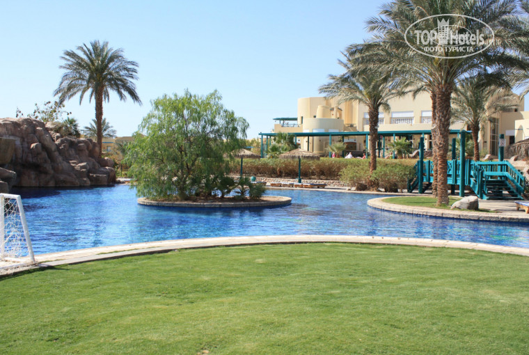 Что представляет собой сам отель, его фото и видео вы можете посмотреть на сайтах (сам я наделал за 2 недели свыше 600 фотографий ). Поэтому увиденное на месте, вполне совпало с картинками. Большая, как по меркам Табы, территория самого отеля, достаточно зелёная. Есть поле и для гольфа и для крокета и перед бассейнами тоже поваляться в травке можно. Кстати бассейнов два, с тёплой и холодной водой, но глубина максимум 1,2 м. (кстати в соседнем "Интерконтинентале" глубина 1,8-2,0м , а в "Софителе" 1,4 м). К бассейнам примыкает кафе –"Grotto" в котором можно вкусить "аллинклюзив" ;) как с воды, так и с суши . Полотенца (бордового цвета) выдают там же возле бассейнов, в обмен на карточку, которую вы получите при заезде на ресепшене. НИКАКИХ номерков на груди или браслетов на руках в "Марриотте" – НЕТ! Не хотите плавать в бассейне, прошу на пляж. На пляже под зонтиками на лежаках с матрасиками, вы можете вкусить как "духовную" (море, солнце….) так и "земную" пищу ;), – рядом пляжный бар с аналогичным аллинклюзив" ;). Кстати, море достаточно мелкое, первые 10-15 метров камни, затем метров 80 песочек, а потом коралловые рифы. Чтобы поплавать на глубине 2,0 метров, Вам придётся идти метров 100-120. Рифы, к слову, по сравнению с Шармом "бедненькие" на живность и цвета , но если вы не были в Шарме , то получите максимальное удовольствие от плавания с маской. Кстати, Вы можете сходить на соседние пляжи, Софителя, Хаята (самый красивый понтон, вокруг которого МНОГО "симпатишных" рыбок и кораллов). Правда если не хотите скандалов, не берите с собой полотенца из Марриотта, хотя пляжи заборами не ограждены, но некоторый персонал из администрации соседних отелей, могут наговорить Вам неприятных вещей, поэтому, идите туда со своим парео или шарфиком, если вам нужно обтереться после купания. Понятное дело, что лежать на ЧУЖИХ топчанах на ИХ пляжах – НЕЛЬЗЯ! Отдельно хочу сказать о жителях морских глубин. Помимо безвредных "рыбок-матрасов" встречаются также белые мурены, морские ежи и "рыба-бабочка", - шипы последних двух очень болезненны (но они сами не нападают, поэтому задеть их вы можете только по своей неосторожности или наступить на дне). Кроме того, видел черепашек, несколько камбал (песочного, а не чёрного цвета, лежащих на дне) и МНОГО других рыбок. Ну и конечно различные формы и расцветки кораллов.
