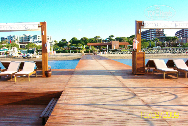 Внешне здание отеля выглядит простенько, но номер стандарт, с двумя раздельными кроватями, нас вполне устроил. Окна выходили на беседку для массажа, получалось, что между корпусами, поэтому ночи были тихие и утром никто не будил. Две дамы из Москвы, чей номер был напротив нашего и выходил на ресторан, жаловались, что утром довольно рано их будил шум и звон посуды. Отель средних размеров, находится в низинке и вида на море не имеет. Нам понравилось, что территория не очень большая, уютная, очень полюбили отдыхать и загорать на пирсе, нравилось, что там нет детей, тихо, спокойно и не обгоришь. Питание вполне устроило, обедали, как правило, в пляжном баре, мне там очень нравилась пицца Маргарита, неплохое обслуживание. Удивляет только, что в турецких отелях, где очень большой процент русских туристов, нет меню на русском языке. Это даже как-то обидно: чем мы хуже немцев или японцев? Ужинали в основном ресторане под живую музыку на свежем воздухе, все чинно, благородно и съедобно. С удовольствием бы съездила еще разок. Неплохой спа, хотя цены "кусаются"', понравился массаж в беседке на улице( делают то ли тайки, то ли балийки, но большие умницы, чувствуется, что профессионалы), до них делал турок, мужчина очень приятной наружности и обхождения, но по качеству проигрывает. Мне понравилось, что там не было назойливой анимации, тихий и спокойный отдых.