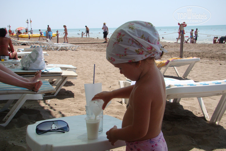 ПЛЯЖ: небольшой, песочный, справа волейбольная площадка, ближе к входу мелкая галька. Зонтиков и лежаков хватало всегда, а выходили на пляж мы часам к 10. Конкретно не хватает бара на пляже!! Представители отеля, услышьте нас, пожалуйста.