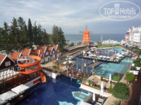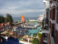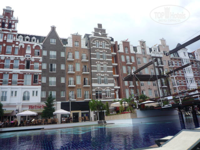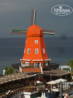 БАССЕЙН – один, но он большой и очень красиво исполнен, из мелкой мозаики и на дне как будто отражение самого отеля, вода чистейшая!!! Много мостиков, все в цветах, красотища!!! Сам отель стоит перпендикулярно морю и на протяжении всего отеля расположен бассейн, так что вид из окон очень красивый, видно и море и бассейн и оду из оригинальных достопримечательностей этого «мини Амстердама» – ярко рыжую красавицу Мельницу.