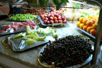 Ежели кому не хватает еды в основном ресторане – есть Food cort. Слева от основного бассейна всяческая еда. И недалеко от домика фотографа с 12.00 до 16.00 раздают мороженое и располагается лоток со всяческими фруктами и овощами: черешня, арбуз, дыня, абрикосы, чищеная морковь, огурцы. Дыня мне не понравилась, безвкусная, а все остальное очень даже хорошо. Кстати, в основном ресторане на ужин ко всем указанным фруктам была еще и клубника. Сладкая. А мороженое еще и на ужин дают.