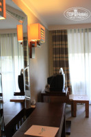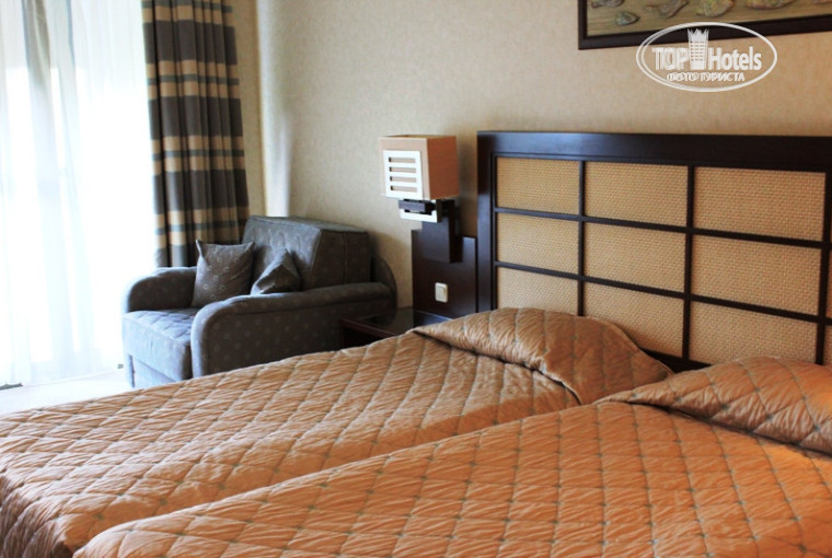 Сам номер, как написала выше, над главным входом, как догадались на 5 этаже! В номере 2 раздельные кровати, которые раздвинули мы сами. Матрас твердый, не проваливается, вроде новый! ТВ "кухонный", оч маленький с одним каналом российским (пульт не работал). Ванная хорошая, без всяких подтеков и ржавчины. Пляжные полотенчики уже лежали под раковиной. Сейфом мы не пользовались, я привыкла все запирать на замок в чемодан) Мини-бар (маленький холодильничек) по заезду была водичка, газ.вода - нам водичку на след.день поставили, коллегам из др.номера - нет, видимо, по желанию горничных))) Вай-фай ловит в номерах, без пароля. Скорость средняя, в скайп выходила норм. На пляже и бассейнах его нет