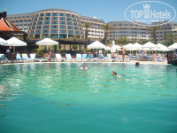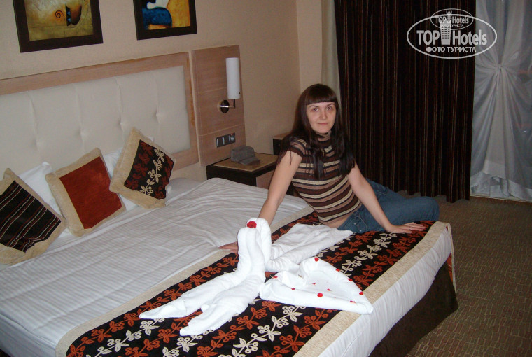 Отдыхали с мужем в конце мая. Остались довольны отдохом оба, хотя преследовали разные цели. Встретили нас очень хорошо. Сразу дали номер с видом на море (без доплаты). Мы живем около дороги в родном городе и шум нам совершенно не мешал. Когда зашли в номер я плакала))) Были и тапочки, и лебеди, и сердечки, и вино, и фрукты. На часах было 2 ночи и мы не смогли полюбоваться видом из окна. На болконе у нас было гнездо с ласточками, но это нам не мешало сушить вещи и проводить время перед ужином за столиком, наблюдая за красотой моря. В номере была кровать,столик, стул, мини-бар с водой,пивом 2 бутылки, пепси и фанта 2л,минералка и сок 2 упаковки по 0,2 мл.(пополняли ежедневно водой,соком и минералкой). В ванной были полотенца,шампунь очень классный (волосы просто супер мягкие, пожалела что не смогу взять с сабой), ватные палочки,шапочки для душа. Утром мы проснулись от запаха завтрака, наш номер был над главным рестораном. Еда все очень вкусно и разнообразно (телятина, баранина,курочка,рыба), иногда проводили тематические ужины (пробовали суши). На завтрак пекут обалденные оладьи и жарят омлетик. территория очень большая и всегда есть свободные лежаки и много места-не чувствуется что очень много народу в отели. Анимация мне не сильно понравилась...я их почти не видела если честно, хотя муж поиграл в водное поло один раз. Ходили в дельфинарий через дорогу...не стоит потраченных денег, была в Геленджике и там оказалось все намного лучше. Брали экскурсии от Пегаса-все очень понравилось, ребята молодцы. Только одно расстроило-шоп-туры включенные в обычные экскурсии. Ладно....можно долго и упорно писать-все отлично)))) Думаю стоит ехать и отдохнуть!!!! Всем ярких эмоций....меня они переполняют.