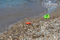 3. Пляж: лежаков много, в любое время дня можно найти место. Пляж чистый, постоянно всё прибирают, подметают, моют. Также можно арендовать шатер, стоило это 10 евро, официант приносит фрукты и напитки. Есть ещё один большой шатер, стоит 100 евро, в стоимость входит и питание в течение дня. Ещё загорать можно на пирсе, там же находится ещё один бар. Вход в море не комфортный, без обуви заходить по камням больно. Заходишь в море - сначала галька, потом небольшой участок песочка, а потом снова галька. Выкладываю фотографию - смотрите сами мелькая это галька или нет.