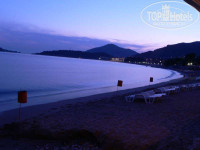 До пляжа буквально 2-3 мин. У отеля есть свои лежаки. Пляж галька.