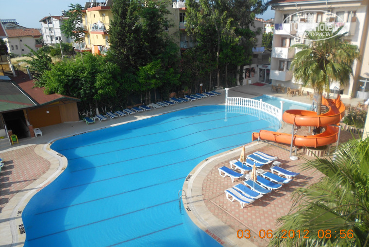 Всем привет!!!Отдыхала в этом отеле с 02.06 по 18.06 2012.Могу сказать одно-лучше трёшки с плюсом я ещё не встречала,хотя побывала во многих из них!!!Его смело можно отнести к 4ке.Изначально меня поразило то,что нас заселили до 12 дня и без проблем!На рецепшене работают очень отзывчивые и понимающие люди,особенно хочется отметить Нану!замечательная девушка,хорошо говорит по-русски,всегда подскажет и поможет во всём!так что проблем у вас не будет!Вообще в отеле много русскоговорящего персонала,администрация отеля всегда в поле зрения и готовы ответить на все ваши вопросы и помочь вам.В номере на моё удивление ВСЁ работало!по-сравнению с другими отелями я ни разу не видела чтоб на рецепшене стояли и возмущались туристы,никто никогда не жаловался!конечно всякое бывает ,но персонал реагирует моментально.Что касается питания,то оно было очень разнообразным,давали индейку,курицу,рыбу каждый день!всякие салаты,даже оливье,и даже 2 раза пекли нам русские блины,а рядом стояли пиалки с разным вареньем и мёдом!!вот этой был кайф!!!голодными не были никогда.в этот период времени я посещала подругу в Алании в отеле 5 зв и честно говоря,есть там было нечего!я обалдела,так как привыкла в нашем отеле к разнообразию и колличеству!Между часами работы столовой возле бара турецкая женщина печёт вкусные лепёшки!Так что всегда можно перекусить с чаем!