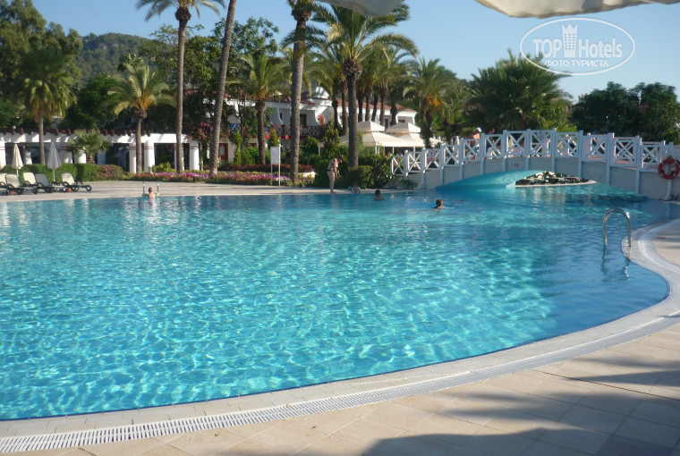 Бассейны как на фото 2 больших, 2 детских, один с водными горками, и крытый (в нем действительно холодная вода). Вода чистейшая, не пахла хлором и застоявшейся водой. Сама территория отеля чистая, смотрю то там поливают, то тут подстригают, в другом месте подкрашивают. В общем молодцы.