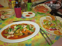 про завтраки: довольно хорошо кормят. есть фрукты каждый день: ананасы, папайя,арбузы, также всегда были всяческие макароны, рис, говядина,курица. сосиски и т.д. Голодными не останетесь-завтраки хорошие)) А с обедами. перекусами и ужинами вам нужно будет самим себе найти заведение по вашему вкусу и кошельку. Мы часто ходили в одно кафе (не могу точно сказать как оно называется) оно находится-направо от отеля и в сторону кругового движения вам нужно будет идти-далее опять направо и практически до конца, там будет тайская школа( многие туристы в отзывах пишут , что это Храм) там еще проходит по вечерам рынок в определенные дни. Вобщем эта кафешка перед школой на правой стороне. ориентир-все коктейли по 89 батт(очень хорошие-советую) и недорого. вот там еда недорогая. вкусная и быстро ее готовят... также все русские туристы-нам советовали кафешку на противоположной стороне, там нарисована КРАСНАЯ ЛУКОВИЦА, там также недорого и вкусно, но всегда очень много народа, ждать не хочется ....Так что перейдите на другую сторону и пройдитесь там...В отеле ни разу не ели и не пили, так что по ценам сказать ничего не могу. Пиво. коктейли. газировку, воду покупали в ближайшем минимаркете(налево от отеля) Пиво ARCHA 40 батт, CHANG 70 батт, Sighna 75 батт, вода 1,5 литра 20батт. Если хотите съэкономить -то вам в минимаркеты СЕВЕН ЭЛЕВЕН- там цены дешевле. самый ближайший от отеля направо в сторону кафешек(от круга направо)