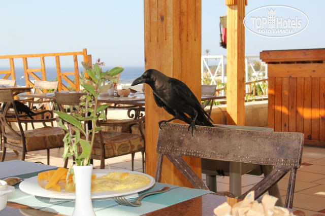 Питание - как уже неоднократно было описано отдыхающими, которые не балуют себя ежедневно дома носами утконосов, фаршированными яйцами молодых выхухолей на обед и шампанским Кристалл на ужин - абсолютно адекватное. Спиртное - пили только вино и пиво, про другое не скажу. Виски всегда беру с собой в дьютике. Основная проблема в главном ресторане это опять же соотечественники, умеющие выстроить километровую очередь за едой и при этом не знают за чем стоят=). Отдельная категория отдыхающих - ценители фруктов, набирающие большие тарелки персиков и арбузов. Непременно с горкой. Даже обслуживающий персонал со смеху падал, когда за 40 секунд сносилась под чистую миска с персиками:) Про ворон - правда. Прилетают на завтрак к 7.15. Часы можно сверять. Фото прилагается.