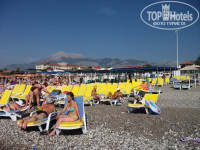 Шезлонгов там нет, ничего нет. Там сначала подальше от воды крупный песок, потом ближе к воде крупная калька, а при входе в воду - помельче камушки. Там везде так в этом месте, и на пляже отеля тоже.