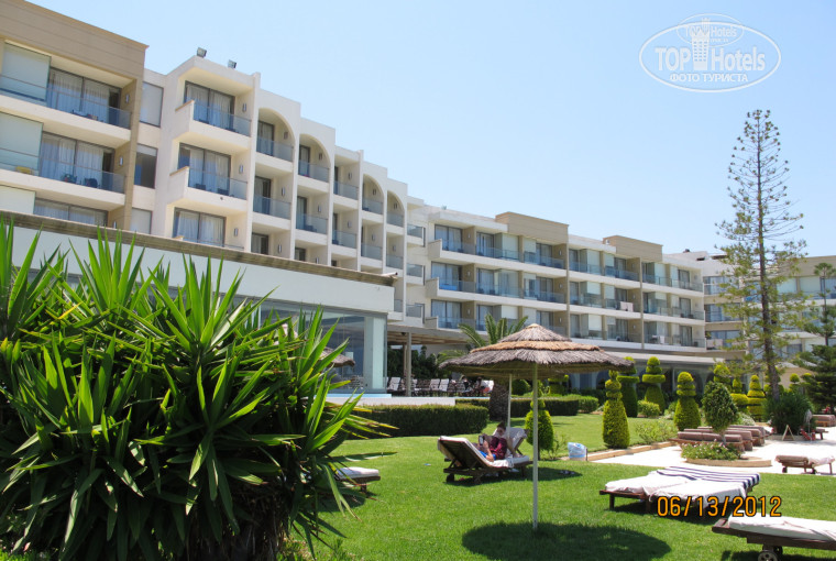 Пляж. Без нареканий. Основной пляж отеля находится на травяном газоне (прикольно) под пальмами рядом с бассейнами, но есть зонтики и лежаки и на гальке у самого моря. Лежаки/полотенца бесплатные. Отель расположен на Эгейском море, так что постоянно дует ветер и на море небольшое волнение. Читал по этому поводу негативные отзывы, но по-моему ветер в жару – это хорошо, а волны совсем маленькие, например не умеющий плавать сын с надувным кругом купался без всяких проблем. В июне температура воды была по сообщению гида +22, по ощущениям +23-24. Кстати, для рассматривающих другие отели информация к размышлению. Чем ближе к городу, тем пляжи на мой взгляд хуже, а волны сильнее. На городской набережной нас просто сдувало, а зонтики на пляже не стояли, а лежали. Для желающих спокойного и чуть более теплого моря – добро пожаловать на другую сторону острова, где море уже Средиземное.