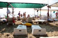 Пляж песчанный,заход хороший очень плавный,море чистое теплое. По моим наблюдениям лежаки занимают интенсивно где-то около 9утра, нам везло всегда хватало. На пляже нет бара,нет воды,нет душа. Возле дальних лежаков волейбольная площадка соседнего отеля,периодически доставалось мячом.
