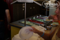 Обед: пицца достаточно вкусная,но за ней стоять минут 7приходится возле печки, один вид супа, картофель, макароны,овощная подлива,редко соевое мясо; блинчики,за которыми тоже очередь;свежие овощи.Из фруктов только апельсины. За чаем надо стоять общую очередь в бар,отдельного автомата нет. Оливок нет,сладостей нет,сыра нет.(см.фото).