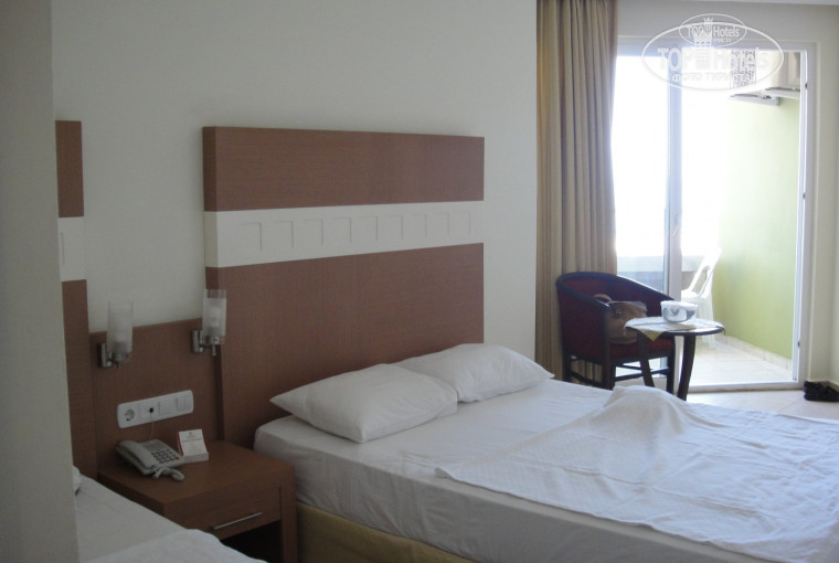 В отеле три корпуса , A и B стоят через дорогу от моря , с их территории есть подземный переход до пляжа.Корпус С стоит чуть дальше в поселке. На корпуса А и В одна общая столовая и бассейн между двумя корпусами. В корпусе С своя столовая,бассейн, и ресепшн, так что ходить никуда не придется.Перед корпусом А находится старое кладбище, но из-за деревьев его действительно не видно,хотя мы жили на четвертом этаже
