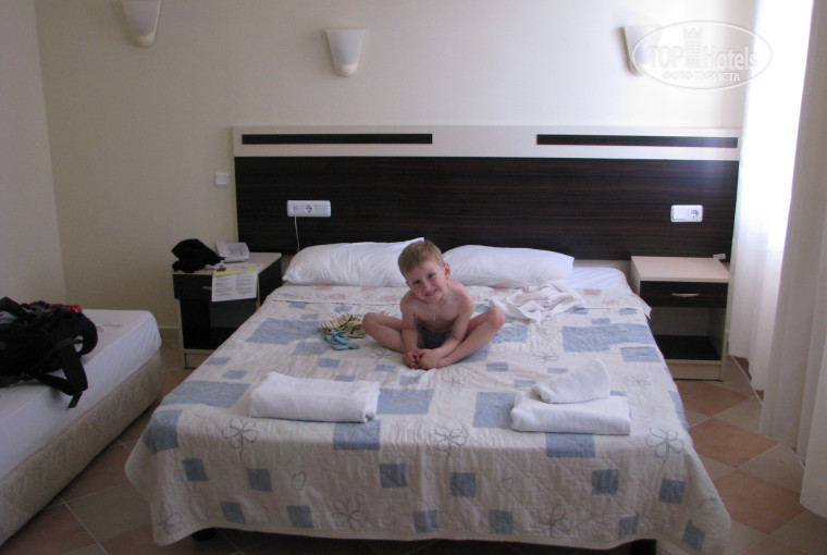 Отель очень понравился. Правда мы с мужем первый раз за границей отдыхали. Сравнивать не с чем. Приехали мы днём, поэтому нас разместили сразу же. Номер нам дали на 3 этаже с окнами на улицу, без балкона. В принципе, номер хороший, чистый, всё замечательно, но отсутствие балкона для меня неприемлемо. Где вещи сушить, полотенца? Я пыталась в ванной развеситься, но это не решение проблемы к тому же с маленьким ребенком, Муж подошел к администратору, сказали, что свободных номеров, к сожалению, нет. Ночь мы переночевали, на следующий день у нас была назначена встреча с гидом от Пегаса, Инной, спасибо ей большое. Она зацепилась за всколь сказанное мной, что у нас номер без балкона, подошла, переговорила и после обеда нас переселили в том же корпусе на 4 этаж. Комната поменьше, но балкон, ванна. Что мы и хотели. Выложу фотографии нашего первого номера и второго для сравнения.