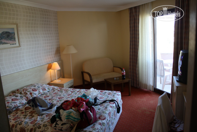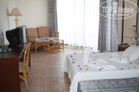 Следуем на ресепшн и там нам говорят что номера как мы желаем пока нет и нужно подождать до завтра (кстати спасибо Ольге, на ресепшне таки-да знают какой номер я хочу), а пока они нас заселят в фэмили номер. Вот тут как-то странно, ведь заранее знали когда мы приедем и не подготовили номер. Итак, идём в номер... номер 5404 в главном корпусе, это последний этаж. Ковролин на этаже и в номере в плачевном состоянии (хотя на втором этаже ковролин поновее и выглядит приятно). В номере стойкий запах хлорки или чего-то похожего, открытые двери на балкон не помогли. Кондиционер работает хорошо, телевизор с кучей российских каналов, в целом техническое состояние удовлетворительное, но видно что номер старый и ремонтировался посредственно. На следующий день после 1000 я подошёл к стойке и мне предоставили другой номер на том-же этаже, причём дали ключ и сказали чтобы мы посмотрели. Запах хлорки был всё такой-же, ковролин тоже убитый, а под окнами был мини зоопарк. При открытии балконной двери нас приветствовал крик петуха:) да и кровати в этом номере было две маленькие. В общем вернулись и сказали что номер не подходит. После этого нам выдали ключ от номера 3305-S это в корпусе Violette. В номере уже не ковролин а плитка, звукоизоляция балкона отличная, звукоизоляция дверей никакая. В номере так-же заметны следы не особо качественного ремонта. Но всё работает. Кстати о минибаре: при заселении выдают карточки на минибар. Две карточки на неделю отдыха. На одну карточку в баре Rose выдают 1литр кока-колы, 1 литр фанты, 1 литр спрайта, 1.5 литра воды. В дальнейшем обычную воду можно взять в любом баре отеля и на ресепшне.