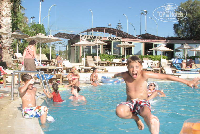 Отдыхали с женой и двумя детьми 9 и 11 лет. Территория отеля оптимальна с моей точки зрения - не слишком большая и не маленькая. Много зелени, много тенистых мест. 7 корпусов, мы жили в пятом, рядом с бассейном. Несмотря на шумные дискотеки на пляже, прекрасно засыпали - окна закрываются герметично. Номера уютные, не с самой новой мебелью, но все довольно прилично. Есть кондиционер, холодильник, микроволновка, блендер, посуда. Убираются чисто, полотенца меняют регулярно. Сейф платный - 2 евро в день.