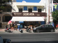 Обедали в соседних тавернах. На четверых обычно тратили от 30 до 50 евро. В первые дни были в шоке от огромных греческих порций. Потом начали брать один салат на всех и вполне наедались. Полюбилось кафе "Soraya" в 5 минутах ходьбы от отеля (идти по правой стороне) - невысокие цены, вид на море, и радушный разговорчивый русскоговорящий хозяин. Воду закупали в супермаркете через дорогу. Упивались свежевыжатым апельсиновым соком (1,79 евро за литр)