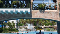 Территория офигительная, я честно говоря ожидал меньшего. Очень много зелени, кустов, цветов. Причем когда за ними ухаживают даже не замечаешь. Вчера были кусты, сегодня бац – аккуратно остриженные квадратные зеленухи. Молодцы! Планировка территории действительно сделана таким образом, что 2300 человек на ней не заметно. Все размазываются по интересам. Хочешь тусить с утра до вечера – тебе к основному бассейну, там анимация, бар, музыка. Хочешь, чтобы твое чадо было на виду – тебе к бассейну у горок. Хочешь моря – тебе на море. Хочешь тишины и релакса – тебе в зону тихого бассейна. Причем «у бассейна» это не имеется в виду на кафельной плитке (на которой в разгар дня можно яичницу жарить), хочешь, можешь оттащить шезлонг в тень пальмы или дерева и замечательно отдохнуть на газоне. Места под солнцем хватало с избытком и у бассейнов и на море. И не важно во сколько ты выполз из номера в 7, 8, 10 или 12, места были всегда, ввиду того видимо, что шезлонгов у Лимры предусмотрено в 2 раза больше чем гостей (их легко можно было найти в общей стопке у правого входа на пляж).