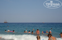 До моря минут 6 . Пляж собственный метров 15-20, но достаточно. Места хватает всем. Лежаки, матрасы-бесплатно. Душ у кафе. При входе стоит кулер с водой и ещё чем-то. Пляж-галька, вода чистая, рядом пирс, но от др.отеля