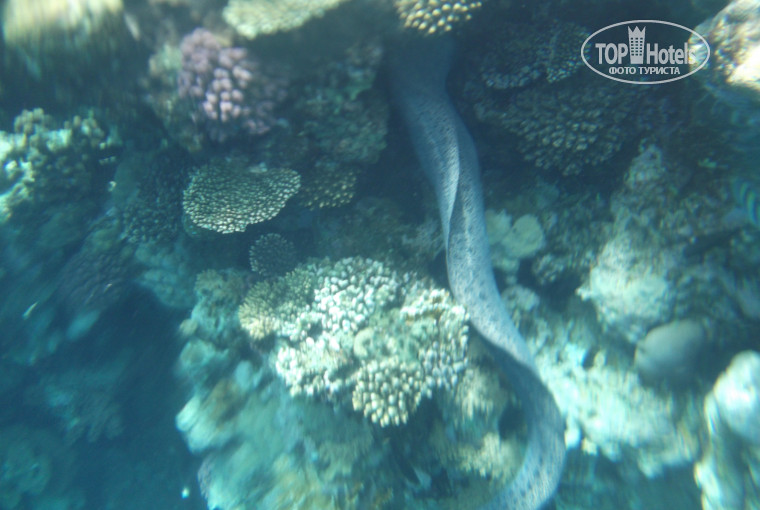 Море бесподобное, особенно подводный риф, кто хочет может даже поснимать, берите с собой мыльницу, чехол для фотика можно купить за 8 долларов(ПЕРВОНАЧАЛЬНАЯ ЦЕНА БЫЛА 15) и вообще торгуйтесь с египтянами, если они называют цену, то смело торгуйтесь до половины, можете даже и дешевле взять, если есть время и нервы. Рыбок много, особенно популярностью пользовалась рыбка по имени Вася, плавала всё время вдоль понтона и любила позировать людям- это местный любимец, пару раз видел мурену- на фотках она есть, говорят даже подплывала акула, но я её не видел, и был ещё скат, но его я тоже к сожалению не видел. Вход на море по понтону, качает его оч сильно, с бодуна по нему не комфортно ходить.Обязательно всем советую брать маски, такой красоты больше негде не увидеть.