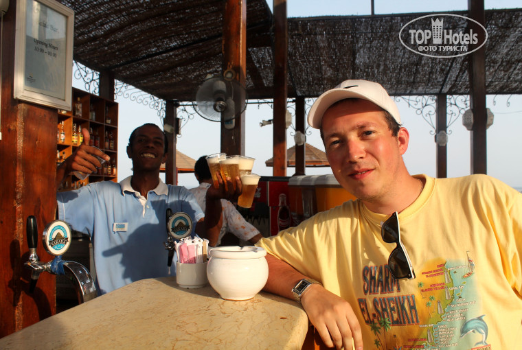 До ресторана от номера 5 мин идти. Еда понравилась, достаточно разнообразная, мясо, рыба всегда, много сладкого,маловато фруктов. Бассейн сразу у ресторана, средних размеров, можно ещё купаться в централ бассейне, но до него далеко ехать. Бар у бассейна работал только до заката, как и сам бассейн.(до 18.15) По системе все вкл. входило 4 бара: у бассейнаГарема, у центр. бассейна, на пляже и Бахиа-бар. Бахия бар в центре работал до 00.00, но там скопище русских, желающих на халяву нажраться.Алкоголь местный не очень, мы пили в основном пиво. В барах с 3 до 5 были фрукты, кексы и мороженое-щербет, а в Бахиа-баре было вкусное белое мороженое, щербет на любителя. До моря мы ходили пешком по лесенке 5-7 мин. Это совсем не напрягало. Заход в море только с понтона, там сразу большая глубина, много кораллов и красивых рыб, поэтому обязательно берите маски. С берега расчищена только небольшая полоска 3м, где пасется куча детей и итальяшек. У Гарема свой понтон, и там гораздо спокойней, чем на центральном.