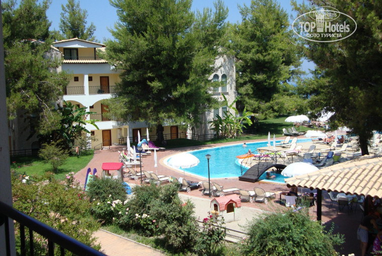 Отель расположен примерно в 250 м от моря. Пляж песчаный, вода очень чистая. При входе в море есть галька и камни. Зонт и 2 лежака стоят 6 евро в день. От центра поселка Ханиоти, где расположено большое количество магазинчиков и ресторанов отель примерно в 1 км. Место, де расположен отель спокойное. Отдыхает много семей с детьми.