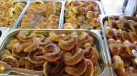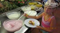 На завтрак очень много вкусной выпечки: булочки, ватрушки (правда, творог не сладкий), круасаны. Ко всему этому можно взять варенья, конфитюры, шоколад. Можно сделать мюсли с йогуртом (его несколько видов), самим добавить туда орешков (они подаются отдельно в разных чашках), для детей есть молоко и шоколадные шарики или хлопья. Сыры в основном мягкие и солёные, брынза очень солёная. На десерт консервированные фрукты. Кофе из автомата. Чай в пакетиках разный.