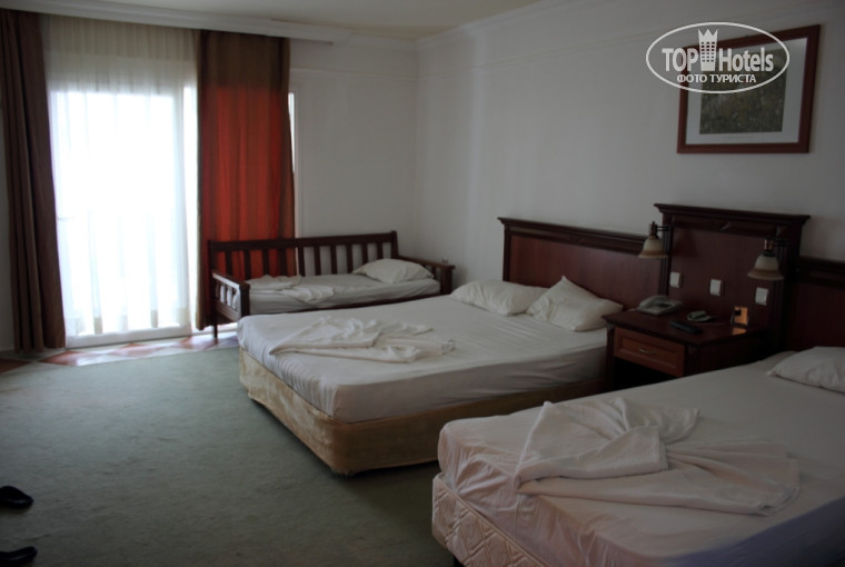 Отдыхали в этом отеле с 28.07 по 07.08. Выбирали отель с территорией и наши ожидания вполне оправдались! По приезду нам надели браслеты и отправили на обед. Потом, просто дали ключи от номера и повезли нас. Мы с дороги, уставшие после длительного перелета, были согласны на все, лишь бы быстрее упасть и в душ! Номер нам дали 807, самый верх номеров, выше только вышка- маяк. Все работало, кроме телефона, который нам не был нужен. Нас было четверо, а кроватей на троих+ диван не заправленный. Походив до вечера с горы в гору, мы были настроены переселяться на следующий день, но по наслушавшись отзывов других туристов, что в номерах плесень, дырки в полах и т.д. , решили остаться, тем более, что при таком количестве еды столько ходить - очень даже полезно! На следующий день взяли сейф и попросили заправить диван. Оставили пачку сигарет и махонькую шоколадку. Пришли и очень приятно были удивлены - все убрано, застелено, хотя гиды сказали, что уборка раз в два-три дня! Так нам делали каждый день за вышеуказанную плату! Плесени не было, номер с видом на море прямой, вещи стирали каждый день, и х/б футболка высыхала очень хорошо за ночь. Вода была всегда и всегда быстро уходила в душе. Из минусов- только один ключ, который забирая с собой, выключается и кондиционер и холодильник. Ходили на море с обеда, не так жарко и народу меньше. На пляже волнорезы из плит, что очень хорошо для детей. Утром были на бассейнах, то с горками, то в основном, на котором были игры в поло и детей оттуда нельзя было вытащить. Детки ходить в мини-клуб и на анимации, им там очень нравилось! Еды нам хватало всегда и везде. На пляже и на баре возле основного бассейна пекут лепешки национальные, прикольно перекусить! Виски пили с коллой, джин со спрайтом, иногда пиво. Его никто не разбавляет, так как несколько раз наблюдали замену кегги, Гиды, действительно, прикольные, всегда с настроением! У моего ребенка был день рождения и нам с ним подарили выездной хамам! Типа мелочь, но очень приятно! Спасибо им за это отдельное! Для себя решили точно - если соберемся еще раз отдыхать, пусть даже не в этот отель, но с маленькой территорией я не поеду точно! Конечно, это не европейская 5*, но 4 вполне заслуживает! Да и при выезде, заказывали машину заранее, приехала вовремя и без опоздания! В общем, всему персоналу привет - главному аниматору, гидам и ресторанным боссам!!!!!