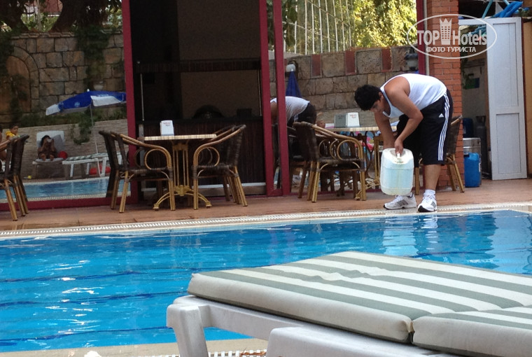 Часов 5 вечера. Куча народа загорает у бассейна, кто-то купается в нем. Тут подходит к бассейну толстопопый мальчик из числа обслуживающего персонала отеля (кто был в этом отеле, поймет, про кого я говорю) с большой флягой хлорки и на виду у всех выливает ее в бассейн. Я понимаю, что во всех отелях чистят бассейны, только хлорку вливают как-то ночью, ну, хотя бы, тогда, когда посетители не видят. Больше в бассейне купаться не хотелось, да и загорать около него. Лежаки у бассейна все разбиты, матрасы разномастные, грязные((
