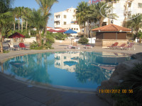 На Кипре в первый раз, сравнить отель не с чем, т.ч. опишу личные впечатления. Отель находится в конце курортной зоны, до центра Ларнаки (Финикудас) на автобусе 10 минут, т.ч. можно и в город смотаться к кафе и магазинам, и в то же время не лежать на пляже как сельди в бочке, и это на мой взгляд плюс. Второй плюс отеля - территория, она есть, есть основной бассей и бассей с дажкузи и детским отделением у бунгало, также есть теннисный корт и газон с волейбольной сеткой, у близлежащих отелей территории небыло вовсе. На этом плюсы заканчиваются. Теперь о минусах. Самый большой минус отеля это жесточайшая экономия на всем, начиная от содержания номеров, все настолько старое и изношенное, что чувствуешь себя как на свалке. Изначально нас заселили в номер 113 с дорогой под окном, т.е. окно не откроешь, а кондиционер у нас в номере не работал, он гнал к нам воздух из кухни отеля а не остужал его, телевизор в наше номере тоже не работал, кровать была жутко расшатана, после долгих препирательств нас переселили в номер 325 с видом на бассейн (фото прилагаются), вода в ванне и в раковине не сливалась, при спуске воды в унитазе, сливался наверное стакан, не больше. Уборка, это отдельная тема, в этом отеле не убираются в принципе, или они не в курсе как это делается. Приходит горничная, забирает мусор, пылесосит центр комнаты и уходит, что в номере существует балкон, санузел, она походу и не подозревает, за 12 дней постельное белье нам не сменили ни разу, на просьбу поменять полотенца отвечали ОК, завтра, и так каждый день, на лестнице у ресторана, кто-то опракинул джем, так его три или четыре дня по ступенькам народ ногами развозил. Вобщем грязь страшенная. С кормежкой то же веселье, конечно можно пытаться что-то комбинировать и разнообразить (мы барли завтрак ужин), но на ужин вам скорее приготовят то, что осталось от обеда, отравлений вроде не было, но качество пищи еще то. В общем если в отель вложить денег, а самое главное поставить толкового менеджера, то он был бы в полне ничего, но на данный момент рекомендовать для отдыха его не могу. Контингент отеля либо пенсионеры, либо молодеж, которая ищет бюджетный отдых не далеко от развлечений. При 30 процентах русских постояльцев, персонал по-русски не говорит.