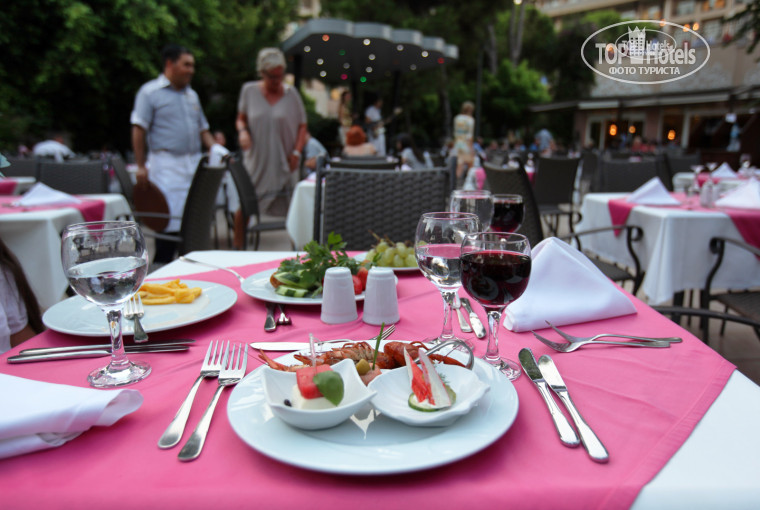 Особых изысков не было типа омаров или лобстеров, но все что надо было для желудка, было всё. На улице вечером шашлыки и прочее мясное меню... для детей отдельный стол в здании главного ресторана. Очень большое помещение, да и ничего, нормальное, даже красивое. Просто до этого читал у кого то на отзыве, что не ресторан, а столовка. Официанты обслуживают по отсекам своим, воду наливают во время обеда и ужина в бокалы, ну и тут же надо заказывать напитки (алкогольные или безалк-е). Когда ещё надо, то просто руками подзываешь того же официанта. Ужинать конечно приятнее на улице. Там живая музыка, обстановка романтичная)) Можно сидеть до закрытия)) Правда столы там быстро занимаются.